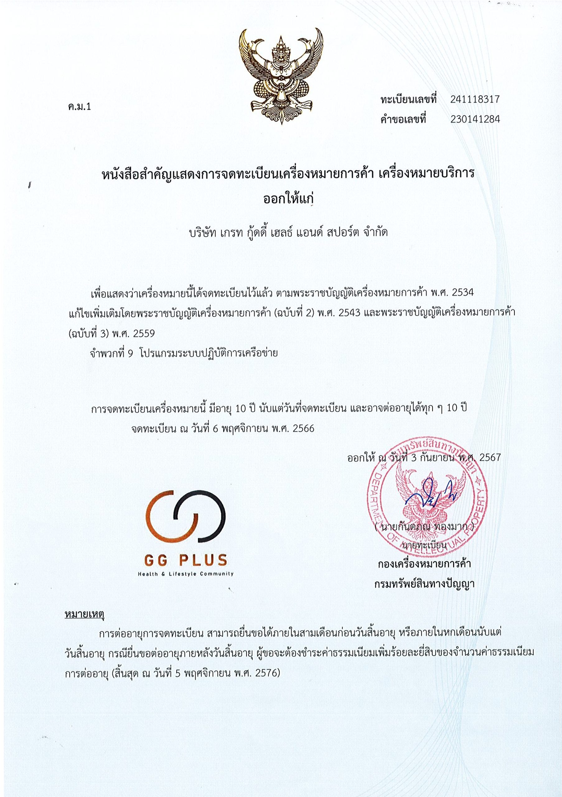 เครื่องหมายการค้า GG PLUS จดทะเบียนถูกต้องตามกฎหมาย กับกรมทรัพย์สินทางปัญญา