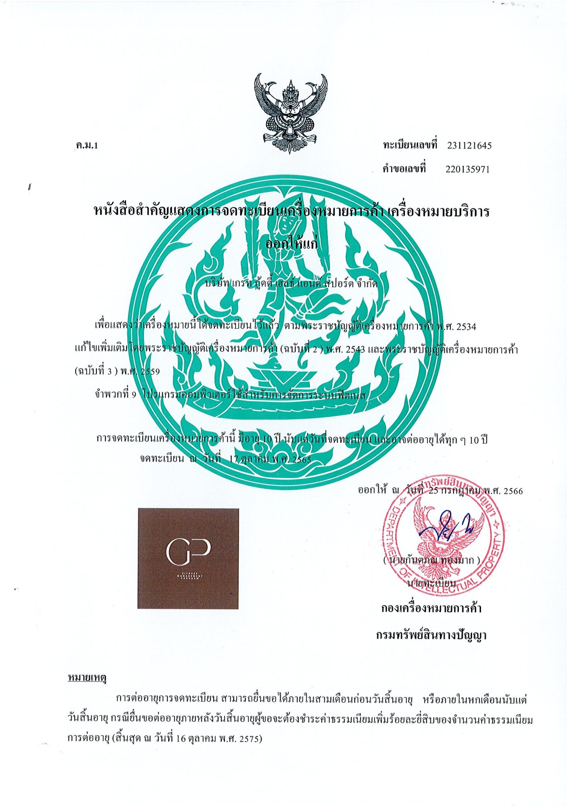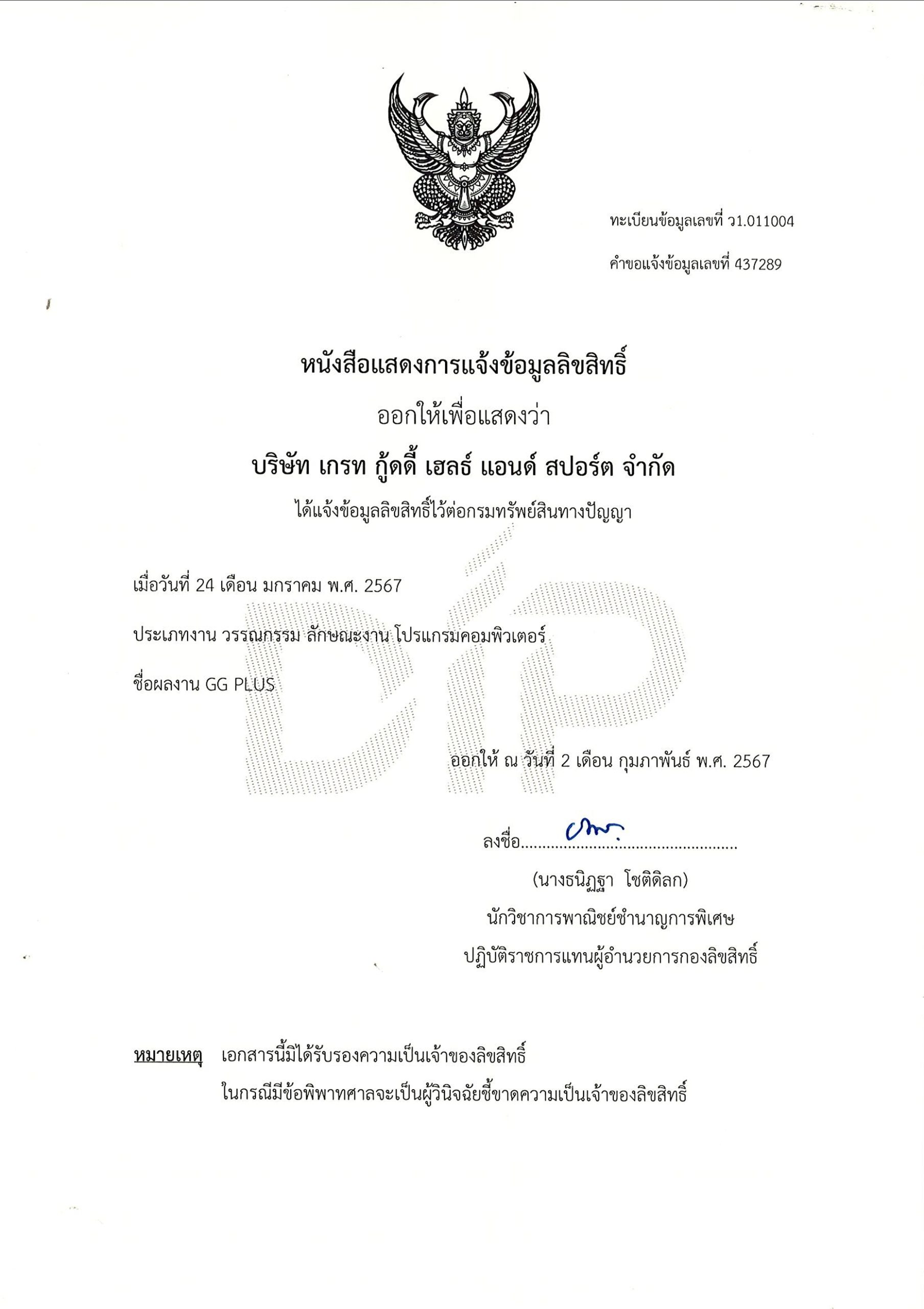 GG PLUS ได้รับการแจ้งข้อมูลลิขสิทธิ์อย่างถูกต้องตามกฎหมาย และขึ้นทะเบียนทรัพย์สินทางปัญญากับกรมทรัพย์สินทางปัญญา ประเทศไทย